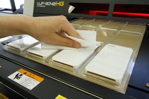O processo de impressão UV aplica diretamente os designs na parte traseira das capas maleáveis, garantindo rapidez e flexibilidade. Utilizando impressão digital, conseguimos incluir até 12 modelos/designs únicos numa única produção. A cabeça da impressora desliza sobre a capa, imprimindo designs intrincados em alta resolução. Lâmpadas UV próximas secam as tintas de forma rápida. Utilizamos o sistema premium Roland LEF-200 para garantir a máxima qualidade, com tintas CMYK e branca. A tinta branca atua como base, realçando a vivacidade das cores e assegurando impressões fotográficas realistas.